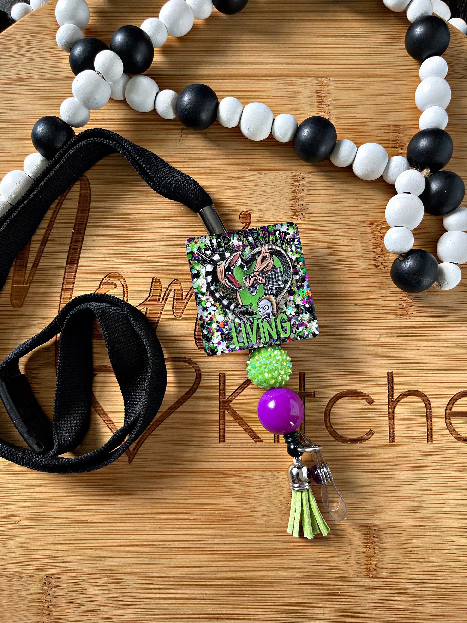 Beetlejuice inspired Retractable Lanyard- Beetle Juice Lanyard-Never trust the living Halloween lanyard- Teacher Gift-